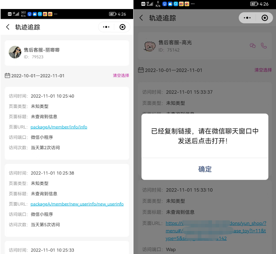 3、在H5/微信商城,上级会员浏览下线的轨迹,若是微信商城链接,可以直接打开跳转,若是小程序路径,仅支持复制,无法直接跳转。